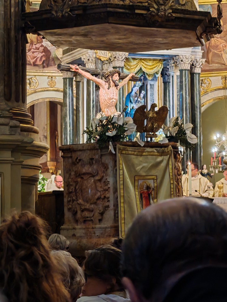 Probabil că nu voi uita niciodată asta, cu atât mai mult cu cât, până în momentul acela eram cam critică faţă de “spectacolul” desfăşurat de sutele de oameni îmbrăcaţi în costume diferite, fiecare după frăţia sau confreria pe care o reprezenta, de pălăriile acelea lungi, înalte, conice, care m-au speriat la început, amintindu-mi de Ku Klux Klan… Nimerisem într-un eveniment extrem de important pentru catolicii de acolo, despre care nu ştiam absolut nimic. Pentru ei era o onoare să participe în procesiunile (45 la număr) care s-au desfăşurat în fiecare zi, începând din Dumnica Floriilor.