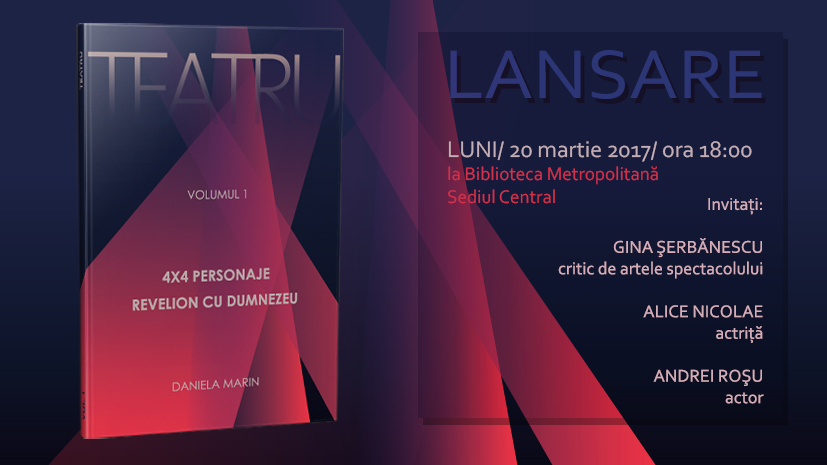 Am creat o nouă colecţie în catalogul Editurii Cartea Daath: Colecţia TEATRU. Pentru că este firesc, această colecţie este deschisă autorilor români contemporani cu precădere. Conceptul grafic al colecţiei şi afişul aparţine Irinei Maria Gănescu, designer. Volumul 1 al acestei colecţii va avea lansarea luni, 20 martie, orele 18, la Biblioteca Metropolitană – Sediul Central.