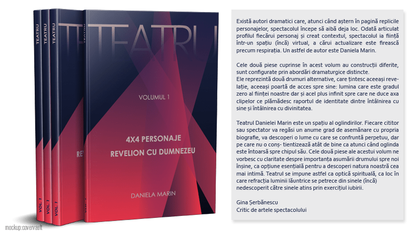 Două dintre piesele prezentate de Teatrul Spiritual, în cei aproape doi ani de când s-a ivit în lume, s-au adunat într-un volum, mai exact în primul volum al Colecţiei TEATRU, în catalogul Editurii Cartea Daath. Conceptul grafic al colecţiei este semnat de Irina Maria Gănescu. Am scris aceste piese…